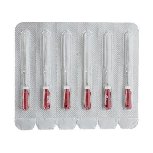 Steril, kiváló minőségű, szuper rugalmas, csúcsminőségű rozsdamentes acélból. ISO-kódolt, autoklávozható, ergonomikus markolattal és szilikon stopperrel. Hossz: 21, 25 mm. 31 mm-es választék. Tartalom: 6 db