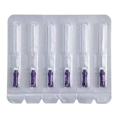 Steril, kiváló minőségű, szuper rugalmas, csúcsminőségű rozsdamentes acélból. ISO-kódolt, autoklávozható, ergonomikus markolattal és szilikon stopperrel. Hossz: 21, 25 mm. 31 mm-es választék. Tartalom: 6 db