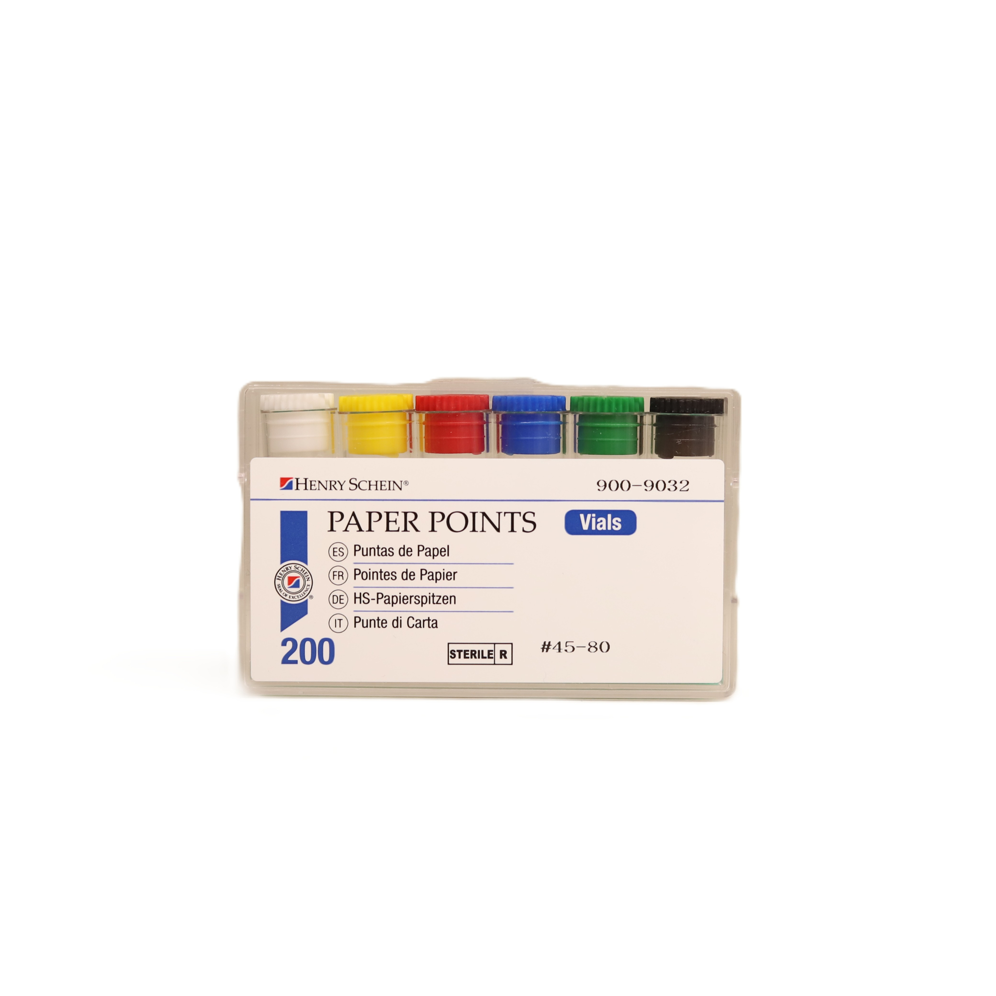 Szilárd, fehér papírcsúcsok gyökércsatornák tisztításához és szárításához. Szilárd, de rugalmas, kötő- és kontrasztanyagtól mentes, 28 mm hosszú. A méreteket ISO színkóddal jelöljük a poén fején.