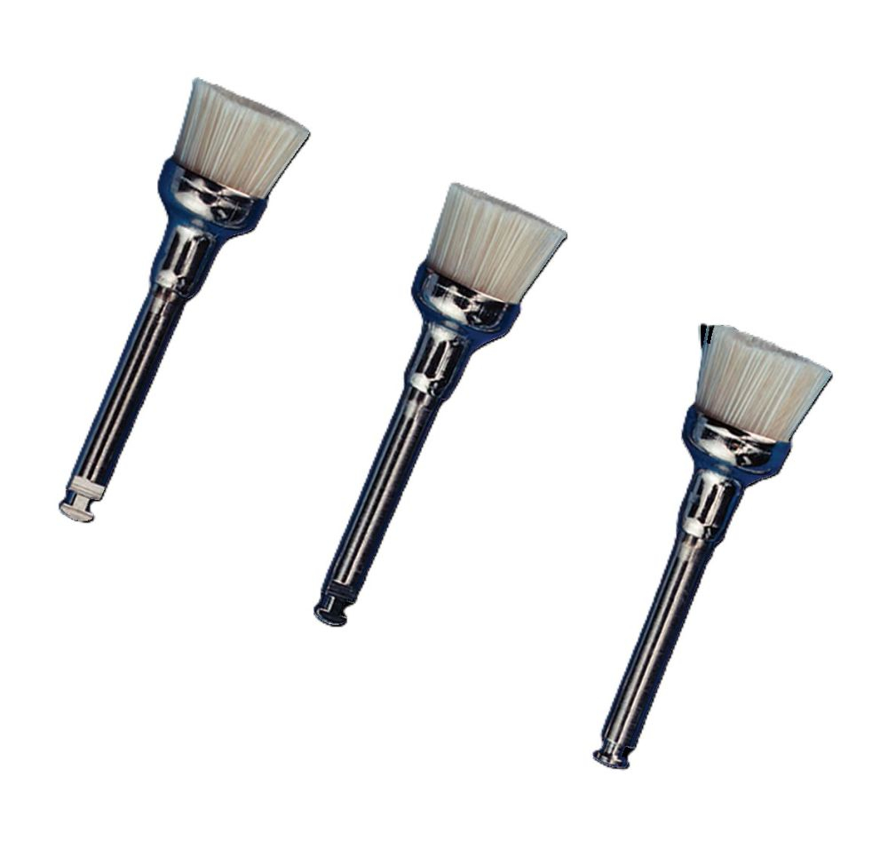 Miniatűr kefék a fogak tisztításához, könyökkézidarabokhoz szerelve.