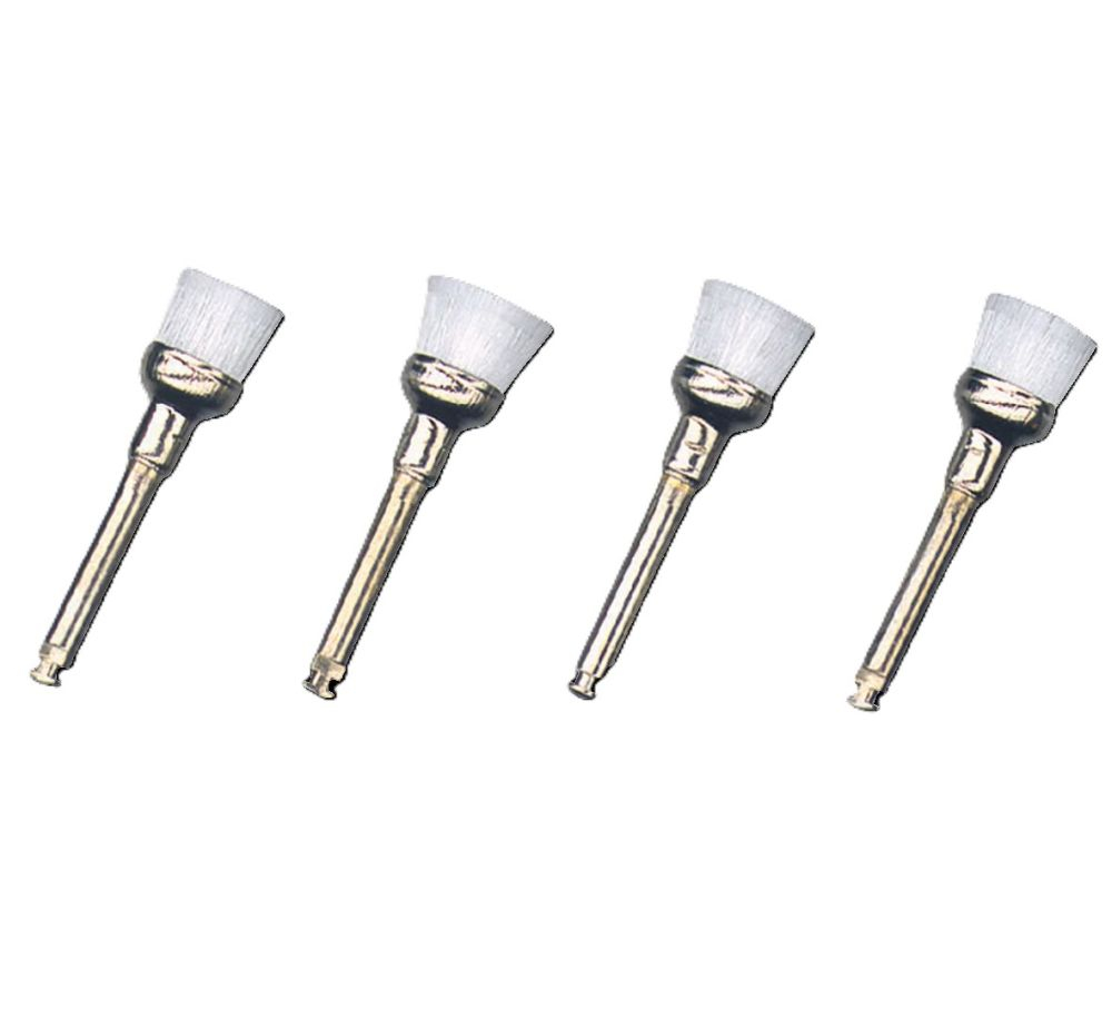 Miniatűr kefék a fogak tisztításához, könyökkézidarabokhoz szerelve.