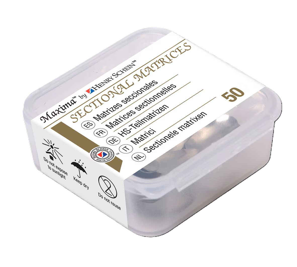 50darab "M" szekcionált matrica. A II. osztályú restaurációk szekcionált matricarendszere előre kialakított matricákból (3 különböző méretben) és szilikon hegyekkel ellátott rögzítő gyűrűkből áll. A rendszer egyszerűséget tesz lehetővé az érintkezési pontok helyreállításakor, figyelembe véve a fog természetes anatómiáját. Magas betegkomfort. A gyűrűk végén található szilikon védők megkönnyítik az illeszkedést. A matrica vastagsága 0,05 mm.